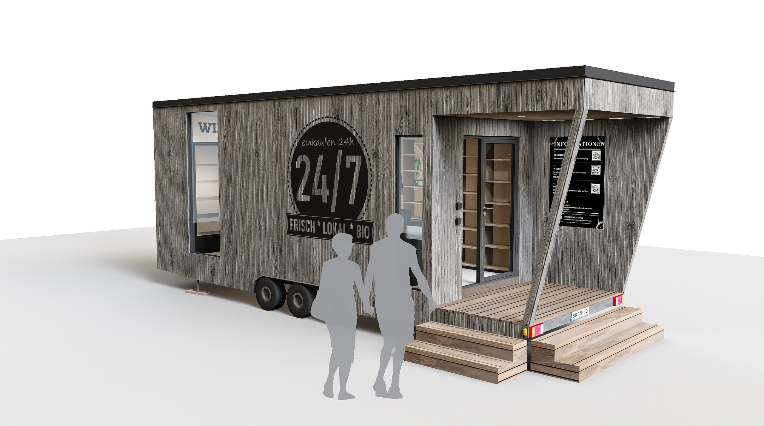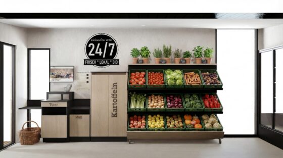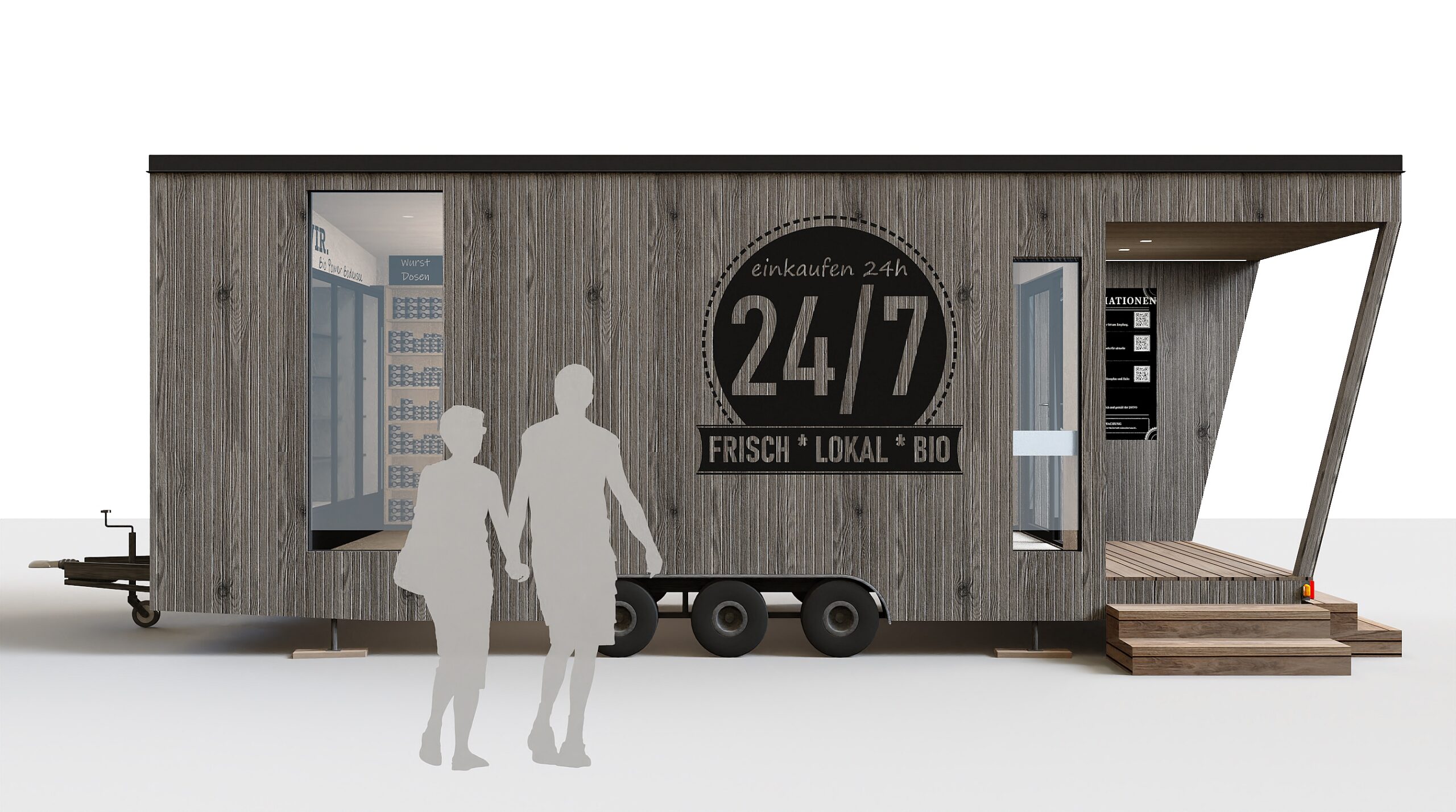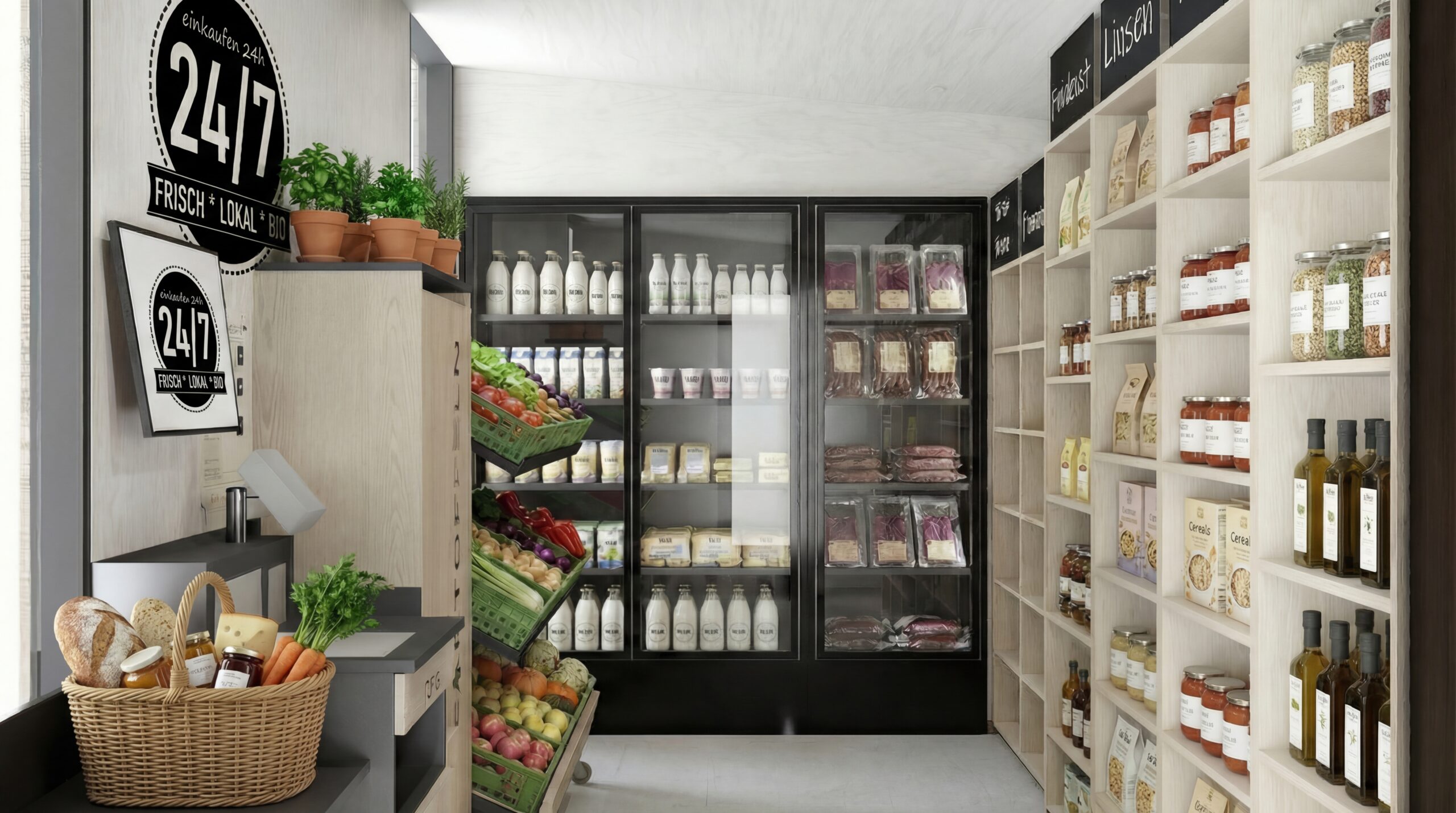 Zum Beispiel neben einem Bioladen oder auf dem Hof eines Eierproduzenten können Verbraucher:innen wenn benötigt ständig Artikel einkaufen. Vollkommen automatisiert - es muss kein Personal vor Ort sein!