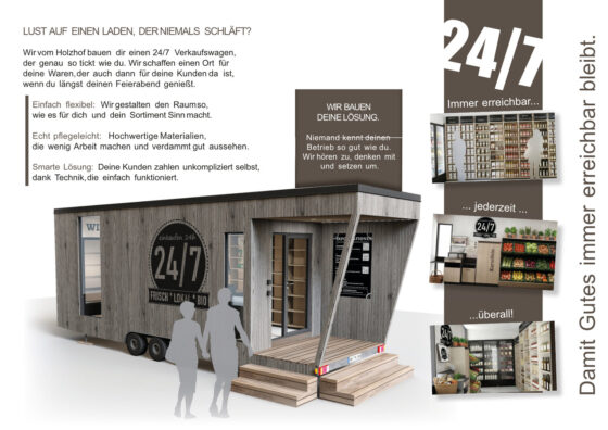 Ist ein Verkaufswagen, der rund um die Uhr geöffnet ist.